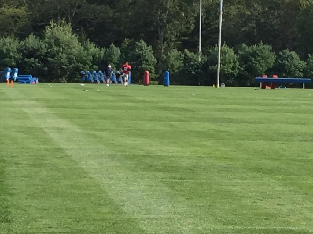 Photo: In the distance, Bill Belichick and Tom Brady finish about a 10-minute chat after practice.
